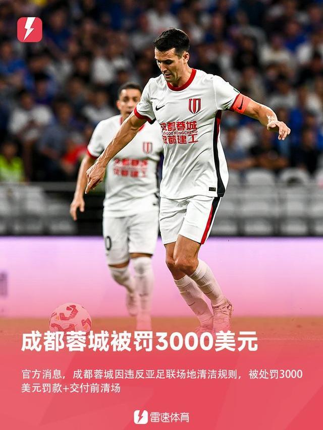 除了 “黄牌多要罚款”,成都蓉城还曾因未清理体育场商业标识被罚款 3000 美元。根据亚足联公告,蓉城的违规场次是亚冠精英联赛附加赛主场对阵曼谷联的比赛 —— 当时蓉城凭借费利佩的梅开二度和杨明洋的进球,以 3 比 0 击败对手晋级正赛。