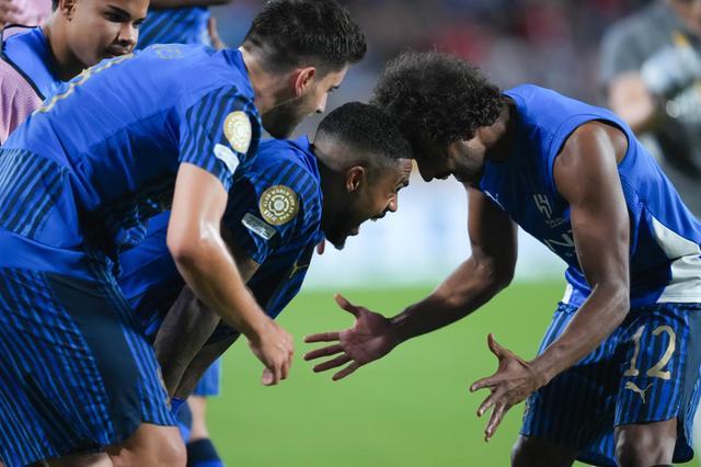 6月30日,利雅得新月队球员马尔科姆(右二)进球后与队友庆祝。当日,在美国佛罗里达州奥兰多进行的2025年国际足联俱乐部世界杯(世俱杯)八分之一决赛中,沙特利雅得新月队4比3战胜英格兰曼彻斯特城队,晋级八强。