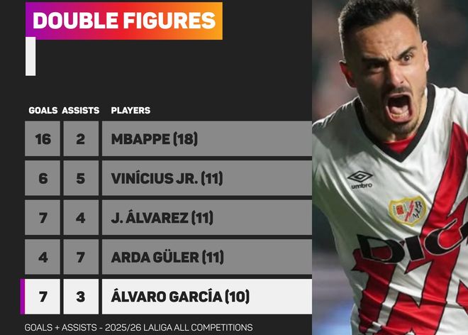 阿尔瓦罗·加西亚是本赛季五大联赛首位制造进球上双的西班牙球员